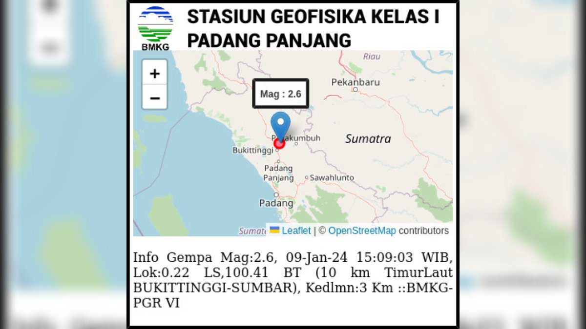 PADANG, RADARSUMBAR.COM – Gempa tektonik kembali mengguncang Sumatera Barat (Sumbar). Usai Mentawai digoyang gempa, Senin (8/1/2024, gempa bermagnitudo 2,6 mengguncang Kota Bukittinggi, Selasa (9/1/2024) sekitar pukul 15:09:03 WIB.
