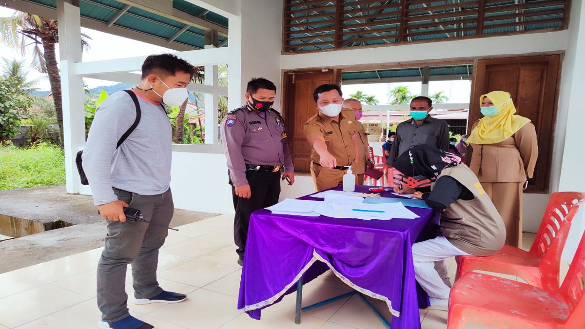 Pantauan radarsumbar.com terlihat anggota Bhabinkamtibmas Kelurahan Mata Air Aipda Nofri tengah memantau lokasi yang dijadikan vaksinasi. Ia mencek tempat duduk, tempat cuci tangan serta keseluruhan hal yang diperlukan untuk vaksinasi.
