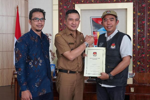 Wakil Wali Kota (Wawako) Padang, Ekos Albar menerima surat undangan dan berkas pemindahan lokasi pemilihan pada Pemilu 2024 dari Jakarta Timur ke Kota Padang. Penyerahan tersebut dilakukan langsung pada Senin (12/2/2024) oleh Ketua KPU Kota Padang, Riki Eka Putra dan jajaran. (Foto: Dok. Prokopim)